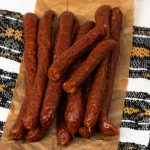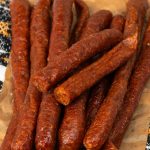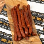 Ingrediente: pulpa de vita Angus slanina mangalita, spata de porc , boia, coriandru, sare, piper, nucsoara, chilly, membrana naturala comestibila