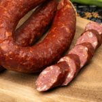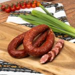 Ingrediente: pulpa vita Angus, carne oaie, coriandru, boia, usturoi, cimbru, sare, piper, membrana naturala comestibila