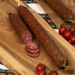 Ingrediente: pulpa vita Angus, slanina tare, sare, condiment salam garlic, membrana artificiala
